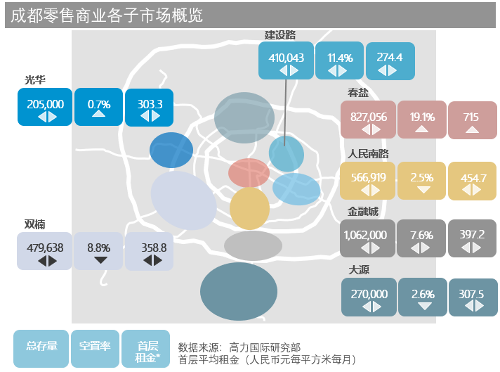 2019年1-8月,成都市实现社会消费品零售总额4837.2亿元,同比增长9.8%, 高于全国1.6个百分点。同时,上半年成都购物中心继续录得小幅增长,带动租金调涨平均首层租金环比上升0.1%至 422.3元每平方米每月。