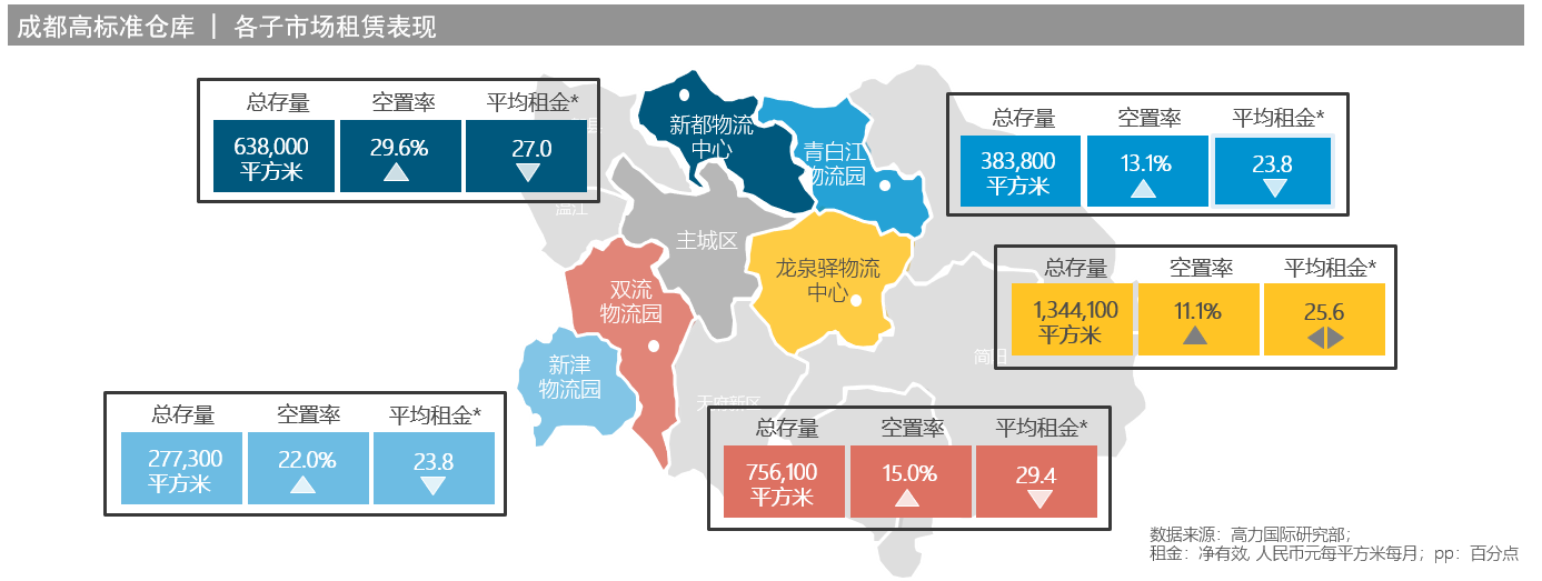 第三季度位于新津以及青白江地区的新项目录得大面积租赁成交,带动全市净吸纳量环比大幅反弹150.9%至11.9万平方米,但同时大量的新增供应也推动市场整体空置率环比上涨4.7个百分点至16.6%。
